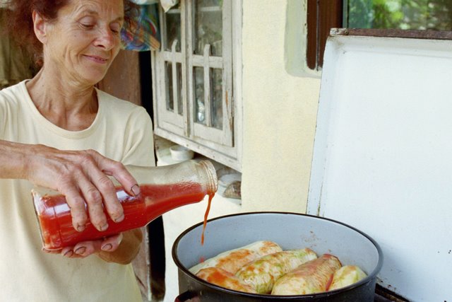 Claudia Serea’s mother cooking squashes stuffed with ground meat filling in tomato sauce, a summer favorite.